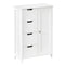 Spousta úložného prostoru pro každodenní věci v koupelně: vysoká skříňka se 2 dvířky, zásuvka a otevřená přihrádka.