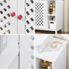 [Moderní design s funkčními detaily]: Pletené čelní plochy dvířek podporují cirkulaci vzduchu a brání nepříjemným pachům, zatímco červené úchyty přidávají svěží barevný akcent a vizuálně povyšují tuto skříňku pod umyvadlem.